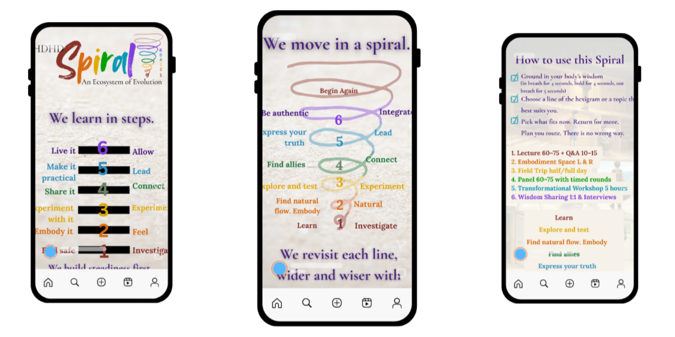 Instead of asking people to adapt to a system, the Spiral adapts to how humans naturally grow. It allows learning to unfold through cycles of grounding, embodiment, experimentation, connection, articulation, and integration.